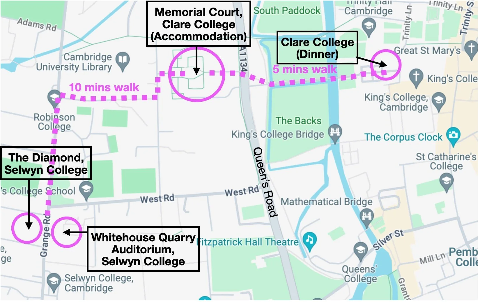 Accommodation is at Clare College’s Memorial Court accessible along Queen’s Road (A1134). Check in at the Porter’s Lodge there. Memorial Court is in between Selwyn College’s Quarry Whitehouse Auditorium, where the conference is being held (10 mins walk), and Clare College itself where Drinks and Dinner are being held on the Thursday evening (5 mins walk).